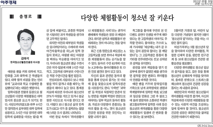 홈 사업소개 사업소개 국립수련시설 알림마당 고객마당 KYWA 소개 사업소개 사업소개 활동운영 지도자양성 지원사업 수련시설안내 수련시설안내 국립중앙청소년수련원 국립평창청소년수련원 국립청소년우주센터 국립청소년바이오생명센터 국립청소년해양센터 국립청소년미래환경센터 국립청소년생태센터 공지사항 공지사항 보도자료 영상&사진 행사일정 자료실 행사신청 온라인신청 특성화캠프 가족캠프 수련시설이용 묻고답하기 KYWA소개 인사말 KYWA 브랜드 조직도 청소년체 오시는 길 기본정보 기본정보 신청내역 보도자료 보도자료 상세보기 [아주경제] 다양한 체험활동이 청소년 잘 키운다 2011-05-19 공유하기 첨부파일 첨부파일이 없습니다. 목록 알림마당 보도자료