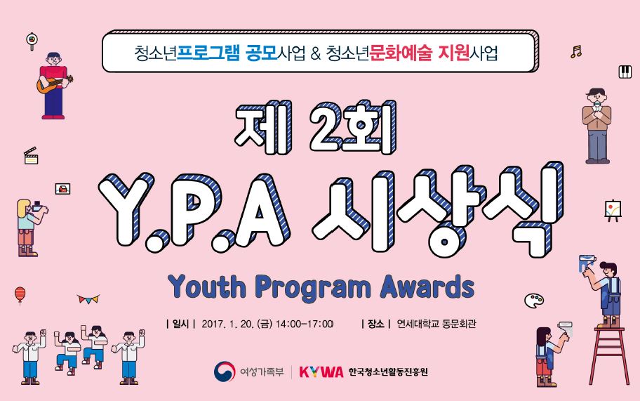 한국청소년활동진흥원(KYWA, 이사장 신은경)은 오는 20일 오후 2시 연세대학교 동문회관(서울 서대문구)에서 「제2회 청소년 프로그램 어워드(Y.P.A, Youth Program Awards)」를 개최한다.