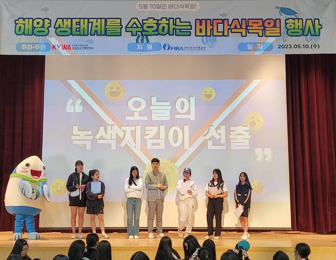 ▲ 바다식목행사에서 ‘오늘의 녹색지킴이’에 선출된 학생들 <사진=국립청소년해양센터 제공> □ 한국청소년활동진흥원(이사장 손연기)이 운영하고 있는 국립청소년해양센터(원장 김동섭)는 5월 10일 바다식목일을 맞아 ‘2023 바다식목일 행사’를 개최했다.