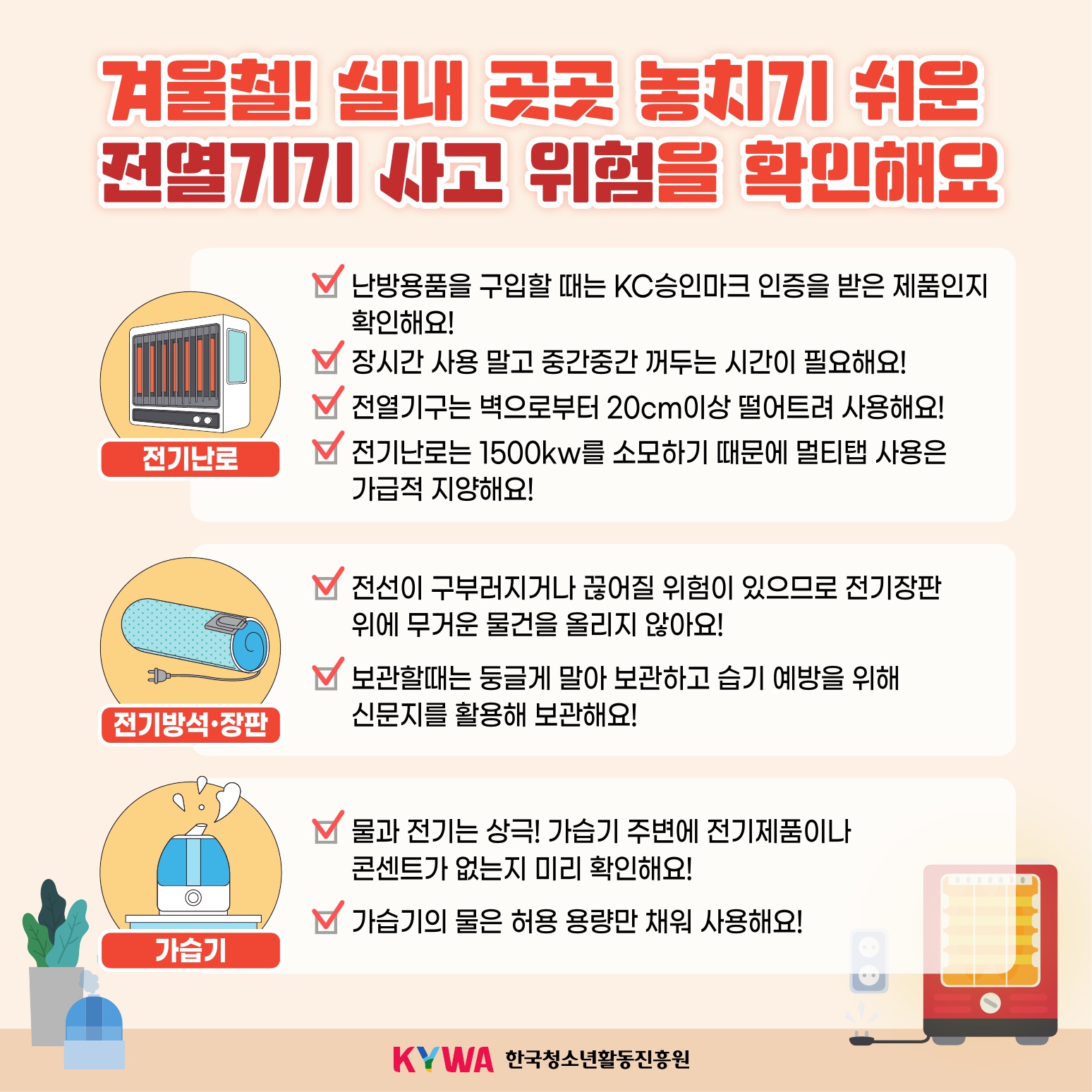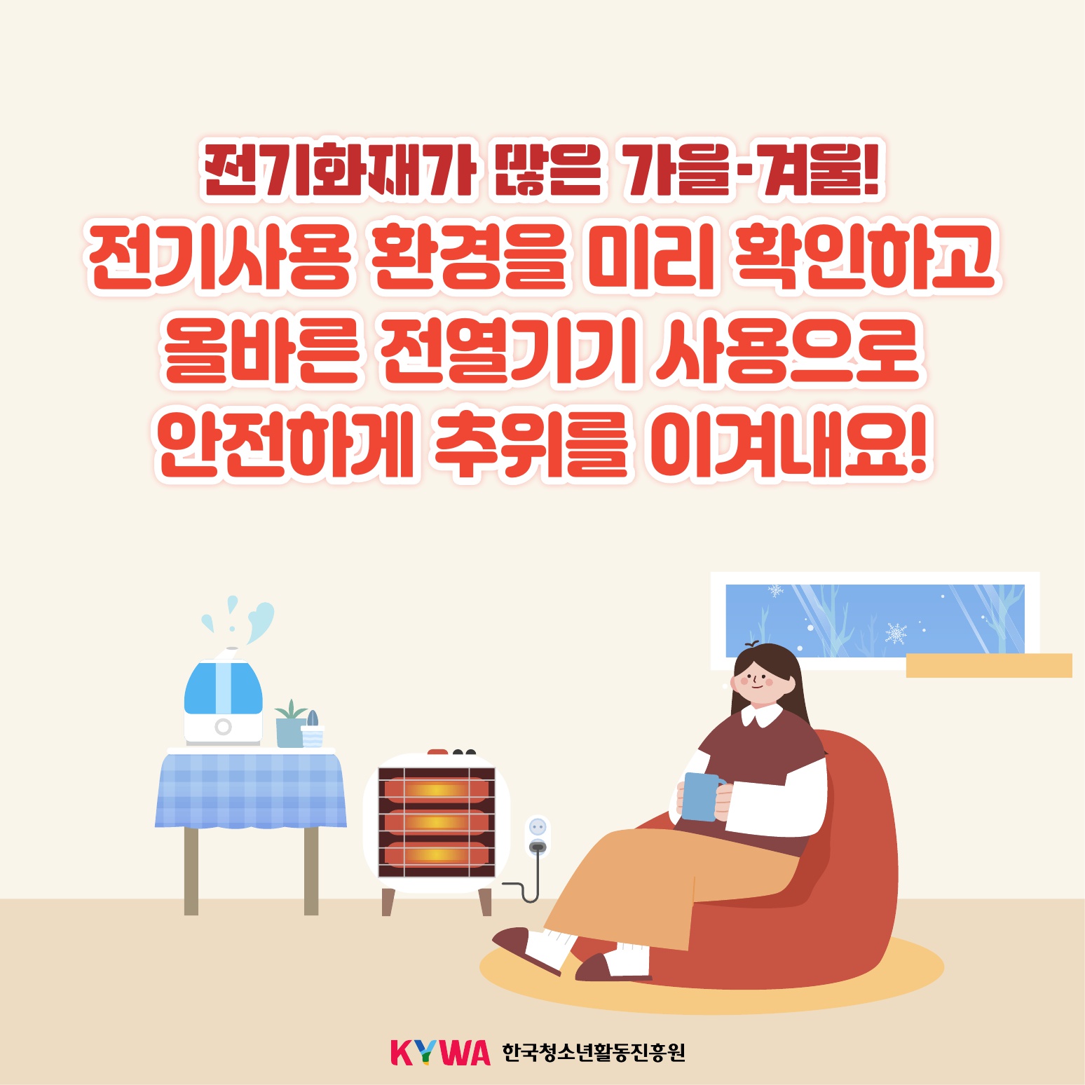 카드뉴스5. 전기화재가 많은 가을-겨울! 전기사용 환경을 미리 확인하고 올바른 전열기기 사용으로 안전하게 추위를 이겨내요! KYWA 한국청소년활동진흥원
