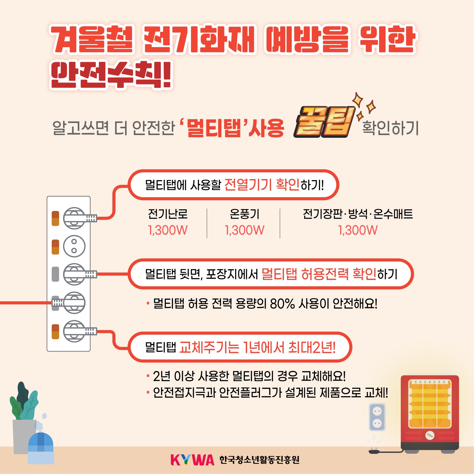 카드뉴스3. 겨울철 전기화재 예방을 위한 안전수칙! 알고쓰면 더 안전한 '멀티탭'사용 꿀팁 확인하기 - 멀티탭에 사용할 전열기기 확인하기! * 전기난로 1,300W 온풍기 1,300W 전기장판·방석·온수매트 1,300W - 멀티탭 뒷면, 포장지에서 멀티탭 허용전력 확인하기! * 멀티탭 허용전력 용량의 80% 사용이 안전해요! - 멀티탭 교체주기는 1년에서 최대2년 * 2년 이상 사용한 멀티탭의 경우 교체해요! * 안전접지극과 안전플러그가 설계된 제품으로 교체! KYWA 한국청소년활동진흥원