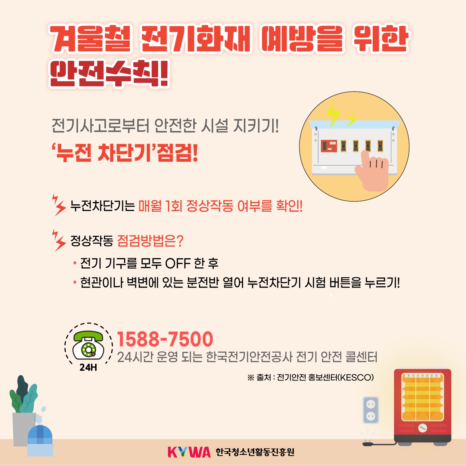 카드뉴스4. 겨울철 전기화재 예방을 위한 안전수칙! 전기사고로부터 안전한 시설 지키기! '누전 차단기'점검! - 누전차단기는 매월1회 정상작동 여부를 확인! - 정상작동 점검방법은? * 전기 기구를 모두 OFF한 후 * 현관이나 벽변에 있는 분전반 열어 누전차단기 시험 버튼을 누르기! KYWA 한국청소년활동진흥원